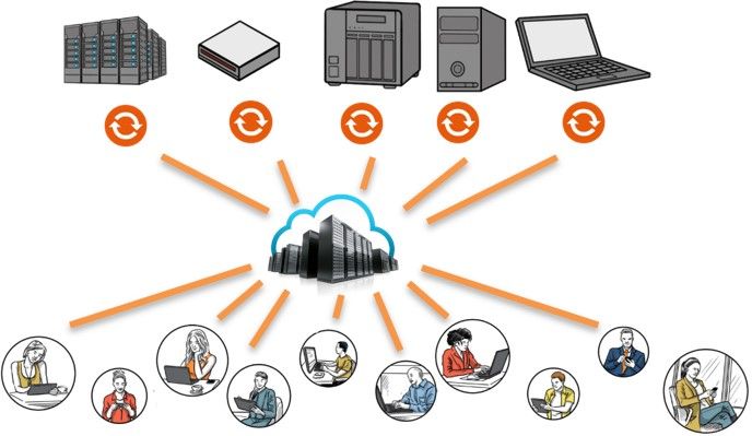 - All files from the entire organizational storage infrastructure can be remotely accessed and shared from the hybrid-IT structure of on-premises storage such as servers, server-attached, network-attached, remote offices, corporate datacenters, PCs and on-premises implementation of SharePoint, cloud-hosted IaaS storage such as Amazon S4, MS Azure and Google Cloud and public clouds such as Box, Dropbox, Google Drive and OneDrive – not limited to subsets