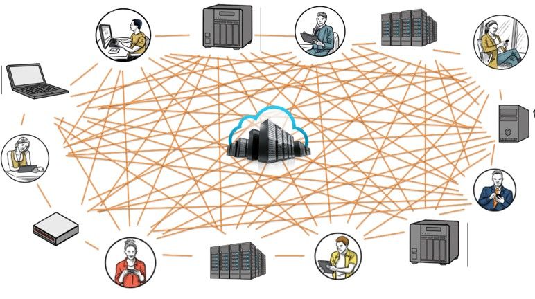 The diagram above shows the basic architecture of traditional centralized cloud storage. It is the architecture of today’s connected world used by all cloud providers whether public, private, EFSS, CCP or hybrid clouds including Amazon, Google, Microsoft, Dropbox, Box and Dropbox. In this model, hundreds, thousands or even millions of devices sync or duplicate a subset of their local storage to a central server cluster. Hundreds, thousands or even millions of users then connect to that server and access their files over the internet. Each user would have their own account on that server and files that they store or sync from their devices are then associated to their account.